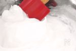 【メレンゲを作る】 卵白に塩を加え、泡だて器で少し角が立つまで泡立て、A グラニュー糖 大さじ3、片栗粉(ふるっておく) 小さじ1 を3回にわけて入れ、しっかりと角が立つまで泡立てる。 |