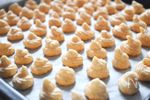 【絞る】 絞り袋に❶を入れ、クッキングシートの上に直径2cm程度の大きさに絞る。 ※一周絞って、その上に半周絞る。 ※絞らずにスプーン等で小さく別けてもOKです。 |