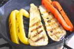 【野菜を焼く】 ❶のグリルパンで塩をふったナスと赤・黄パプリカに焼き目が付くまで中火で焼く。 |