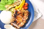 【盛りつける】 器にご飯(炊き立て)、食べやすい大きさに切った鶏もも肉、ナス、赤・黄パプリカ、サラダ菜を盛りつけて完成! |