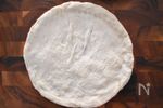 【成形する】 寝かせた生地をオーブンの天板サイズに切ったクッキングシートの上にのせ、麺棒で3mm程度の薄さになるまで伸ばす。 焼いた時に生地が膨らまない様、フォークで生地全体に穴を空ける。 |