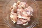 【下味を付ける】 鶏モモ肉に塩とにんにく(すりおろし)を揉み込み、5分置く。 |