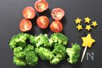 【材料を切る・加熱する】 鶏モモ肉は一口大に切る。ブロッコリーは食べやすい大きさに切り、電子レンジ(500w)で1分加熱する。ミニトマトは半分に切る。黄パプリカは星形で切り抜き、爪楊枝で刺す。 |