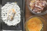 【衣を付ける】 混ぜ合わせたA 溶き卵 2個分、片栗粉 大さじ2 に下味を付けた鶏モモ肉を浸し、合わせたB薄力粉 大さじ8、鶏がらスープの素(顆粒) 小さじ2、黒胡椒 小さじ½ を全体にまとわせる。5分置いて衣を馴染ませる。 |