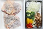 【材料を切る・下味を付ける】 鶏もも肉の両面に塩、胡椒をふって下味を付ける。 玉ねぎ、にんにく、レーズンはみじん切りにする。ブロッコリー、赤・黄パプリカは食べやすい大きさに切る。素焼きアーモンドは細かく砕く。 |