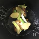 A 長ネギ(上の青い部分) 1本、しょうがスライス 4枚くらい、炭酸水 500ml の準備をします。 |