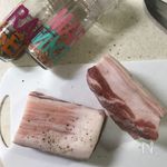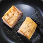 豚バラブロックは半分くらいに切りフォークで肉全体を刺し焼き縮みを防止します。 刺し終わったら塩胡椒(分量外)をして全体的に馴染ませます。 |