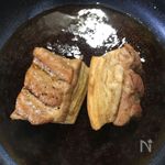 フライパンに油をひかず 脂身の方から焼き色がつくまで豚肉を焼いていきます。 |