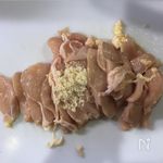鶏胸肉は なるべく薄くそぎ切りにして砂糖をしっかりもみこみます。 砂糖のザラザラ感がなくなるまでしっかりもみこんで下さい。 |