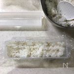 ボウルにご飯と白ごまを入れて混ぜ合わせラップをしいた上に混ぜ合わせたご飯を細長く置きます。 私は100均で買った太巻きの型を使用しています。 |