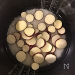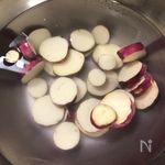 さつまいもは皮付きのまま しっかり水洗いし好みの厚さに輪切りします。 水を入れたボウルに輪切りにしたさつまいもを入れて浸して置きます。 |