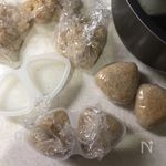 30分経ったら 炊飯器のスイッチを入れて炊きます。 炊き上がったら しっかりご飯を混ぜて好きな量手に取りぎゅうっとおにぎりの形にしていきます。 私はある程度のご飯をラップにのせたら100均で買ったおにぎり型に入れて作りました。 ✱ここまでの工程で冷凍する事も可能です。 |
