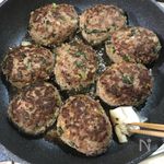しっかり捏ねたら 肉ダネを好きな個数に分割して丸め 温めたフライパンに並べて両面焼き色がつくまで焼きます。 途中余分な脂が出て来たらキッチンペーパーなどで吸い取って下さい。 |