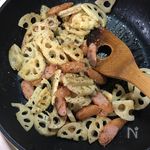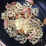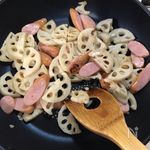 蓮根が透明になってきたら お好みの大きさに切ったソーセージを入れて混ぜ合わせながら炒めます。 |