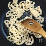 温めたフライパンにオリーブオイルを適量入れて(分量外)熱し水切りした蓮根を入れて透き通るまで炒めます。 | |