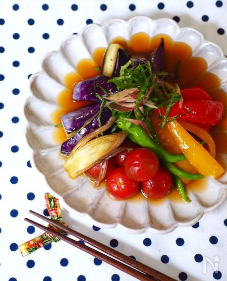 めんつゆとおろししょうがでさっぱり風味に仕上げた、野菜がたっぷり食べられる一品。なすは半分に切って表面に切れ目を入れ、みょうが、ピーマンは半分に切って、素揚げにしてめんつゆに漬けます。かぼちゃやれんこんなどもおすすめ。おそうめんのトッピングにしても美味しくいただけます♡