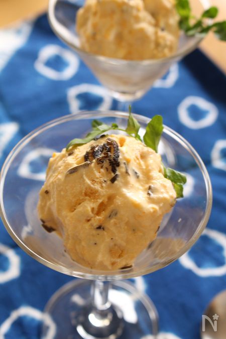 かぼちゃと好相性の塩昆布を刻んで加えることで甘味を引き出してくれます。かぼちゃをメインにすることで、アイスの分量は1人分1/2カップで大満足のボリュームになるのもポイントです。