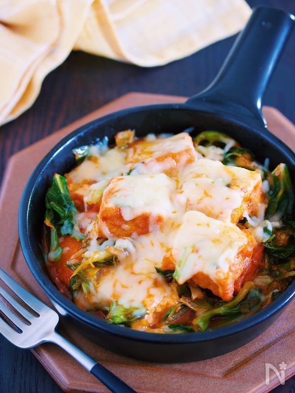 厚揚げ、キャベツ、チーズとフライパンに材料を重ね、10分蒸し焼きにするだけでOKの簡単おかず。旨辛味の決め手コチュジャンは、子どもが苦手なら赤味噌で代用可。ピザ用チーズをたっぷりのせて熱々をハフハフ召し上がれ♪