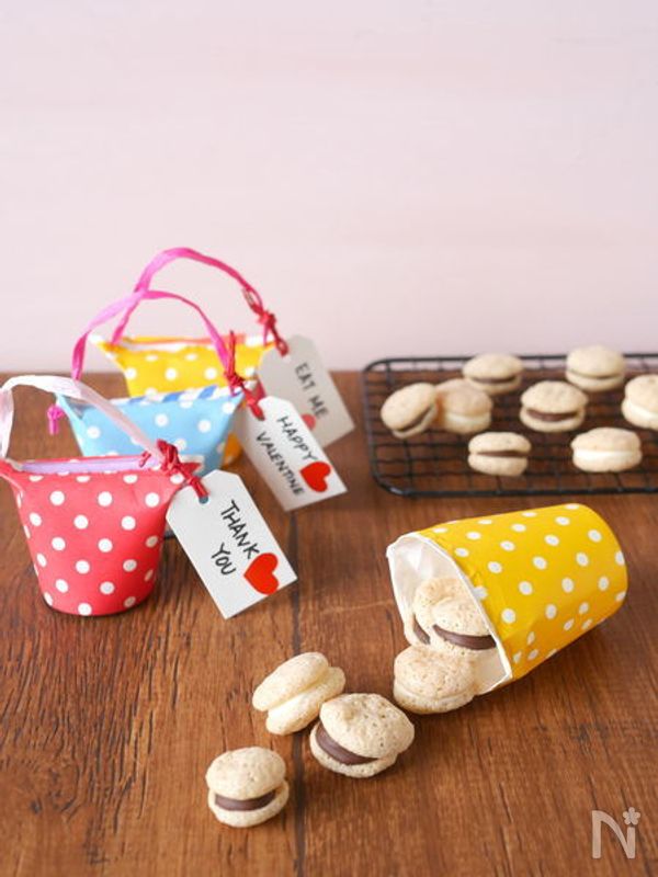 サクサクのクッキーに、チョコレートとクリームを挟んだプチスイーツ。小麦粉を使わず、アーモンドプードルとメレンゲで生地を作ることで、焼き上げたときサクッとした食感に♪ 食べやすく、見た目にもかわいらしいのでプレゼントしても喜ばれます。