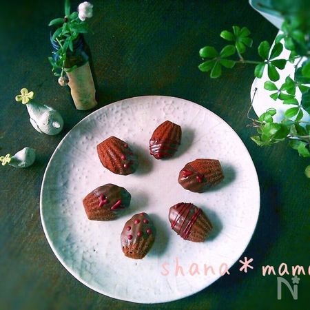 小さなシェル型で焼いたかわいいマドレーヌ。生地にココアを加えてチョコ味に仕上げます。溶かした板チョコをかけたり、チョコペンで柄を描いてアレンジするのも楽しい♪ コーヒーや紅茶とも相性抜群で、秋の夜長のお供にぴったりのプチスイーツです。
