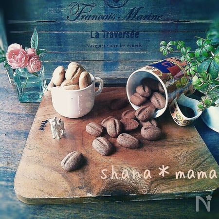 コーヒー豆そっくりの形がかわいいコーヒー風味のクッキー。お湯で溶いたインスタントコーヒーを生地に加えて作ります。成形のポイントは、生地を小指大の大豆状に丸めたあと、包丁の背で切り込みを入れること。さっくりした食感とコーヒー風味があとをひく美味しさです。
