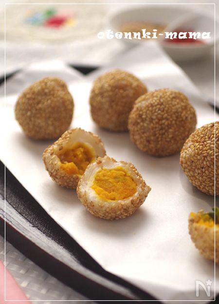 かぼちゃは皮を落として加熱し、やわらかくします。アーモンドパウダー、きび砂糖、シナモンを加えて小さく丸めたら、あんが完成。次に白玉粉に水を混ぜて柔らかくしたものを丸めてから、円形に広げてあんを包みます。これに白ごまをまんべんなくつけて揚げます。ふだんのおやつにもぴったりです♪