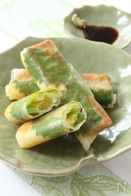 斜め半分にカットした春巻きの皮に大葉、スライスチーズ、アボカドをのせて包むだけ♪ 揚げずにフライパンで焼き上げる春巻きです。
