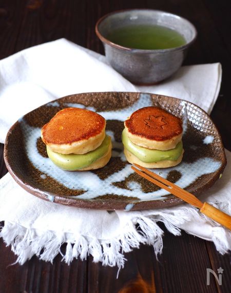 白玉粉入りのもっちりした生地で餡子とバニラアイスを包んだ、上品な雰囲気のスイーツです。生地を焼くときは、くっつきにくいようにテフロン加工のフライパンを使うのがおすすめ。生焼けだと破れてしまうので、焼き加減にご注意を。中身のアイスが少し溶けてきたぐらいが食べごろです。ほろ苦い抹茶との組み合わせで絶妙な美味しさに!