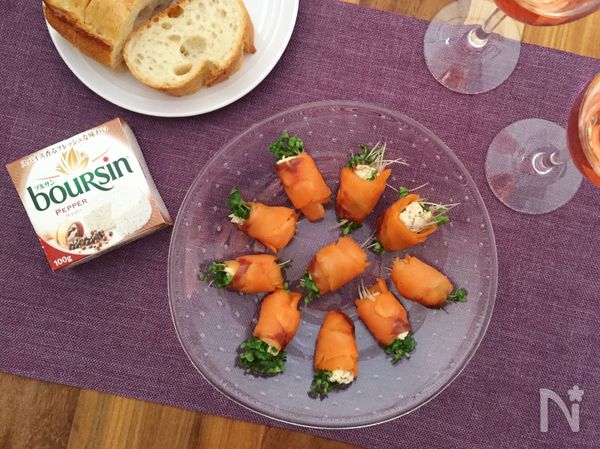 サーモンに、ブルサン ペッパーとスプラウトをくるりと巻くだけで、おいしいオードブルのできあがり!