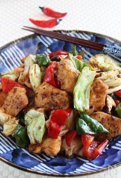 サラダ油を熱したフライパンでキャベツ、ピーマンなどの野菜を蒸し焼きに。1度取り出し、下味、小麦粉をつけた鶏むね肉を焼きます。めんつゆなどの調味料で煮詰めたら、野菜を戻してざっくり炒めて完成です♪