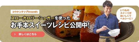 スローカロリーシュガーの魅力や、おすすめレシピをまとめたこちらのページもぜひご覧ください。料理研究家のコウケンテツさん監修の料理やスイーツなどいろいろなレシピを紹介していますよ!