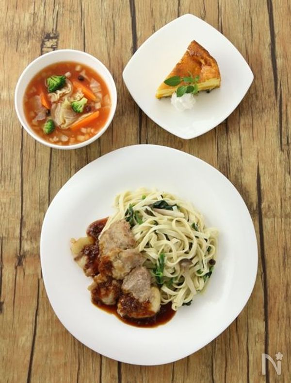 まずは、洋食の献立です。200gの豚肩ロース肉のソテーやパスタ、ミネストローネ、そしてかぼちゃのチーズケーキとかなりガッツリとした内容ですが、野菜をたっぷり使っているので栄養バランスがよく満足感の高い献立。