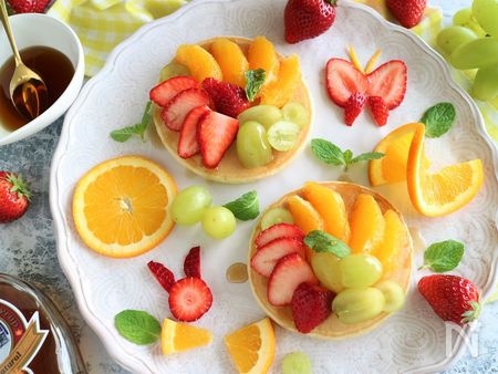 イチゴ、オレンジ、マスカットなど、旬のフルーツをたっぷりトッピングしたら、パーティ向けの一皿に! お好みでミントやメープルシロップを添えて召し上がれ。