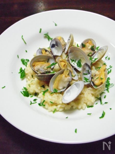 あさりの茹で汁でスープを作り、お米に少しずつ加えてコトコト煮つめたリゾット。見た目はシンプルだけど、まろやかで深い味わいに。おもてなし料理にもおすすめです!
