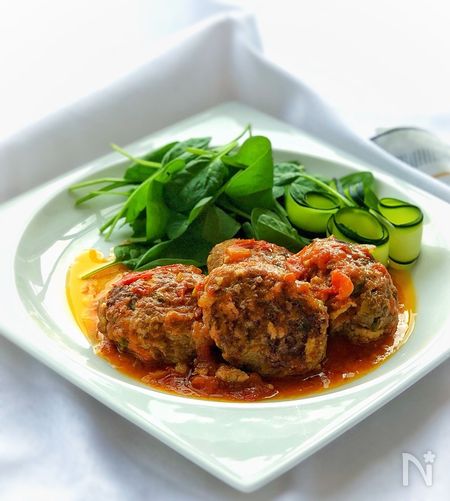 フレッシュトマトをたっぷり使ったソースで煮込んだ、夏にぴったりのハンバーグ。おくらやヤングコーンなどの夏野菜をハンバーグにも練り込んで、栄養バランスもばっちり整うヘルシーレシピです。