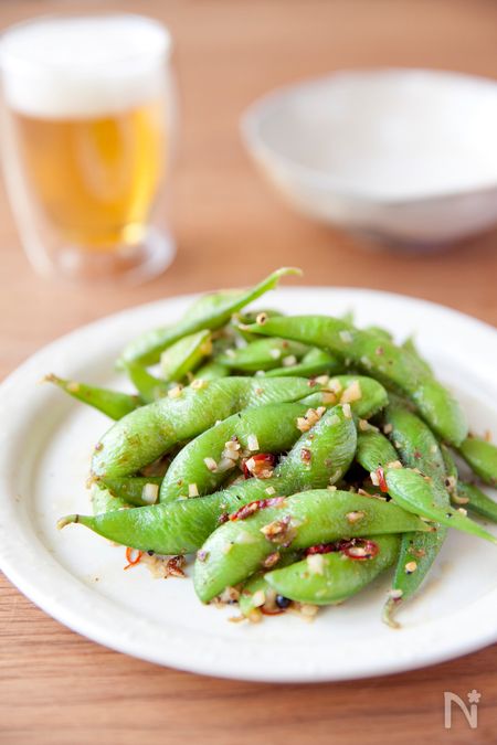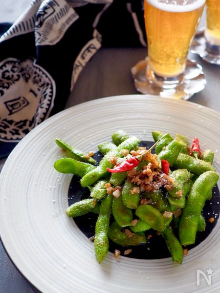 にんにくと赤唐辛子でピリッと風味づけした、お酒がすすむおつまみ。枝豆を加えてサッと炒めたら、少量の水を加えて蒸し焼きにします。枝豆の両端をカットして、味を染み込ませるのがコツ。