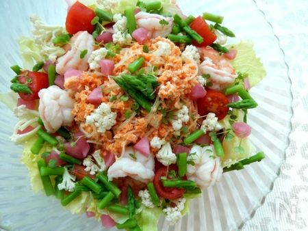 えびやアスパラをカラフルに飾った、見た目もゴージャスなサラダ。春雨はサッと茹で、細かく刻んだにんじんと合わせてピリ辛味に仕上げます。鶏肉やえびのほか、野菜もたっぷり盛り付けたら、一品で大満足のボリュームに!