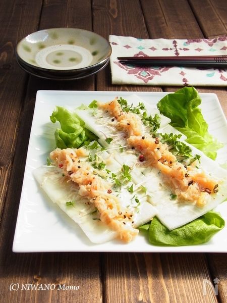 カラフルペッパーが味の決め手!大根とほたて缶のカルパッチョ