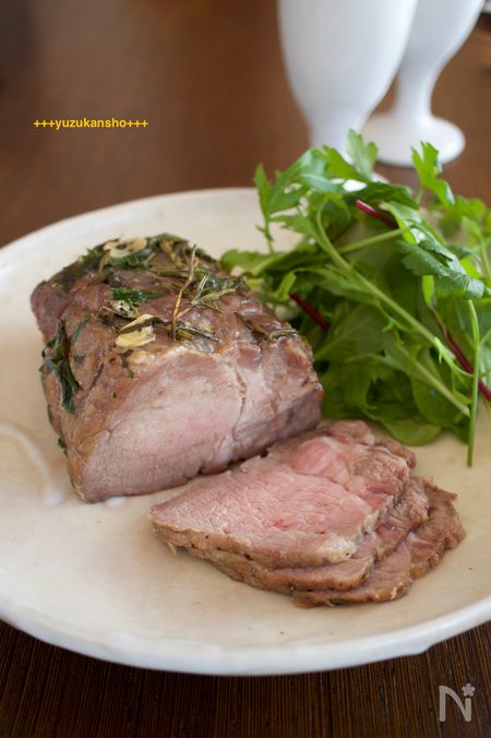 ブロック肉に塩こしょうを揉み込んでハーブをまぶし、オリーブオイルと白ワインを振ってから冷蔵庫で3時間以上寝かせます。室温に戻してオーブンで焼き、休ませたらできあがり! 時間をかけた分、ジューシーな仕上がりに。
