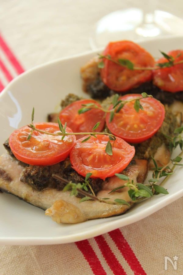 オリーブ、アンチョビ、ケイパーなどでコクのあるペーストを作り、トマトと一緒にさんまにのせてオーブンへ。オリーブペーストと焼きトマト、フレッシュなタイムの風味で、いつものさんまがごちそうに!