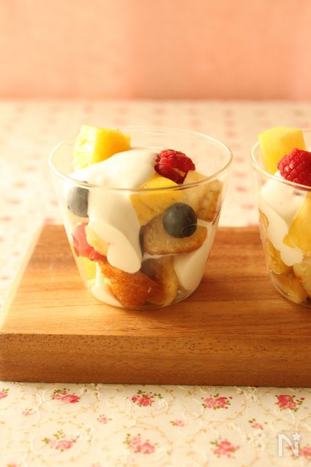 マドレーヌやカステラなど、スポンジ系のケーキを食べやすい大きさにカットし、りんご、パイナップル、ベリーなども同様に準備します。クリームはヨーグルトに生クリームと砂糖を合わせて泡立てたヨーグルトクリームを。爽やかな風味で甘いものが苦手な方でも大丈夫!
