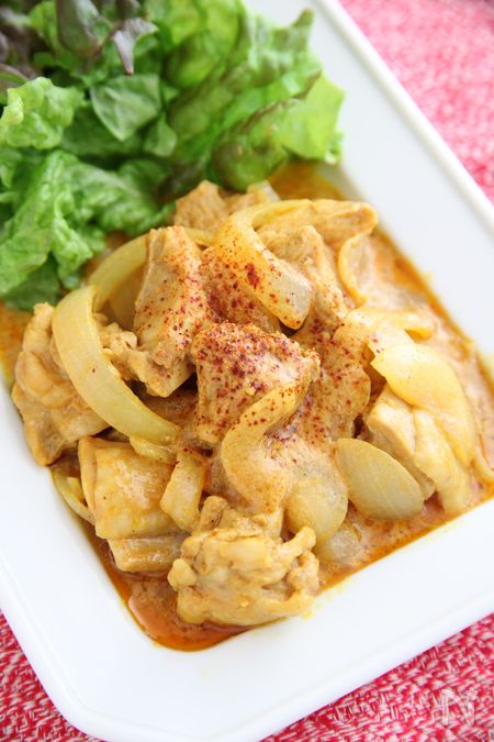 新玉ねぎが出回る時期に作ってみたいのがこちら。ヨーグルトをたっぷり使うことでマイルドな仕上がりに。鶏もも肉、スライスした玉ねぎ、ヨーグルト、カレー粉、ウスターソース、ケチャップを混ぜ合わせ15分から30分置きます。油を熱したフライパンに入れてふたをして、途中で何度か混ぜながら10分ほど焼いたら盛りつけて。仕上げにチリパウダーをふっていただきます♪