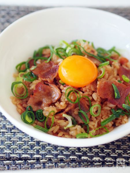 豚バラ肉を焼いて焼肉のたれで煮詰めた中にごはんを投入! お皿に盛って中央に卵黄を落とし、刻みネギをたっぷりかけてでき上がり!