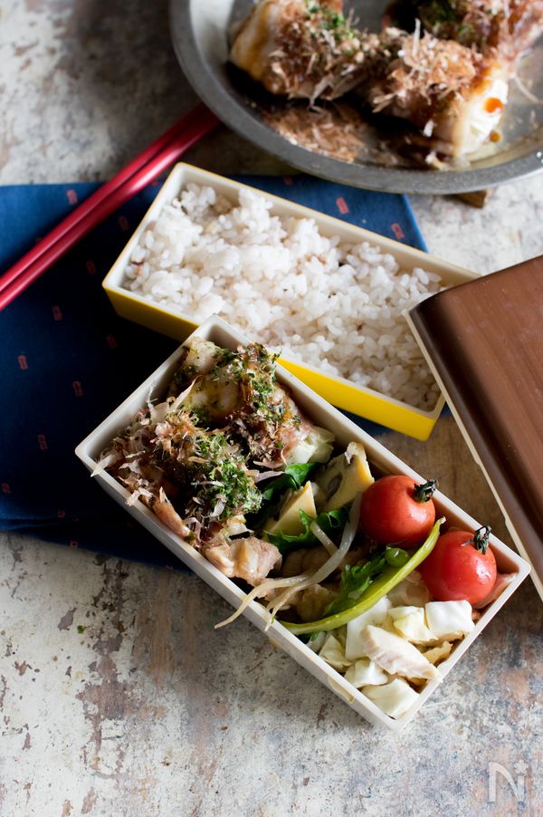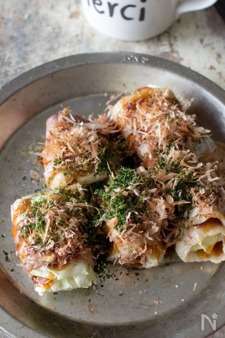 あっという間にお好み焼き風のおかずができちゃう、うれしいレシピ。塩コショウした豚肉で、キャベツをクルクルと巻き、トースターで焼くだけで完成。キャベツはなるべく四角くなるようにカットするのがポイントです。両面をしっかり焼いたら、ソースや青のり、かつお節でお好み風のトッピングを。