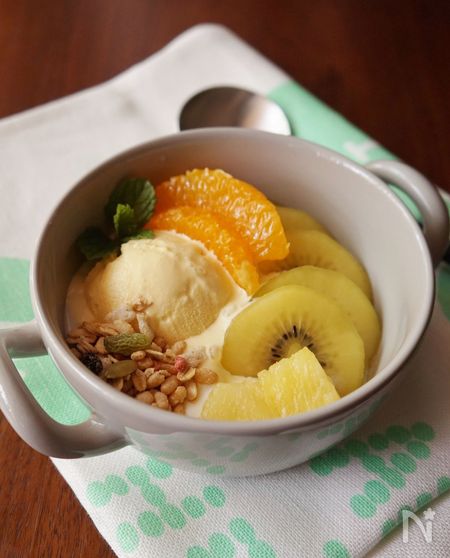 プレーンヨーグルトの上に、キウイなどの果物を並べ、バニラアイスとグラノーラをトッピングします。アイスクリームは栄養価が高いので、このように果物やグラノーラと組み合わせれば、軽食としてもおすすめです。