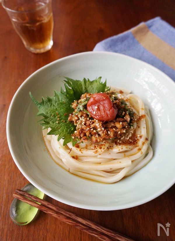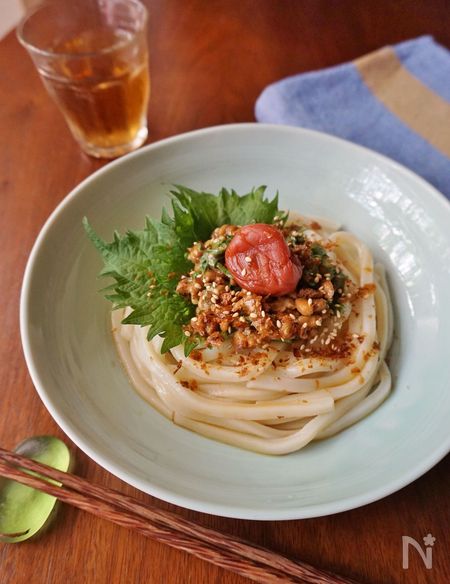 梅や大葉、ポン酢の爽やかな酸味が楽しめる和え麺です。大葉や梅には抗菌作用があるので、ジメジメとした梅雨時期にもぴったり。納豆も一緒に和えると麺と絡んで食べやすく なり、栄養バランスも整います。おかかのふりかけをかけると、カリッとした食感が楽しめてうま味もアップするのでぜひ試してみてくださいね。
