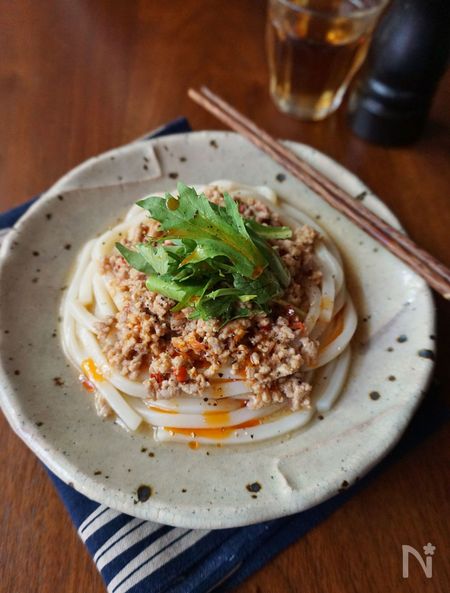 豆板醤とラー油の辛さが食欲を刺激する坦々風うどんです。肉味噌はレンジ加熱で手軽に作ることができますが、練りごまや刻んだ干しえびを加えているので本格的な味わいに仕上がります。しっかりとした辛さなので、水菜やレタスをのせるのがおすすめ。お好みでパクチーを添えても美味しいですよ。