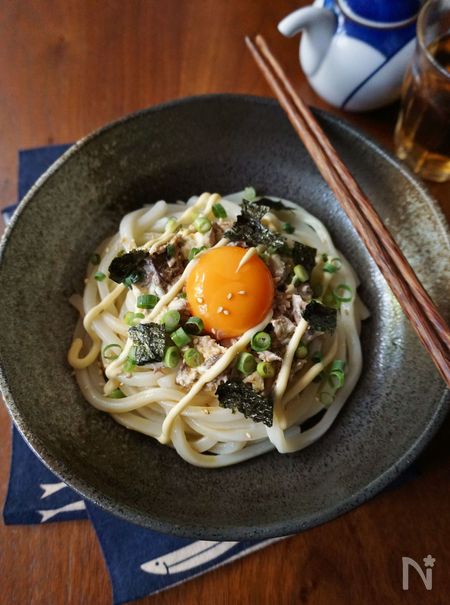 健康食材としてすっかり定着しているさば缶。常備しているご家庭も多いと思います。さばの身をほぐしてマヨネーズと醤油で和え、うどんと混ぜ合わせながらいただきます。卵黄を崩しながら食べると、コクが増して満足感も得られますよ。火も使わず、身近な材料のみで思い立ったらすぐに作れる手軽さもうれしいポイントです。