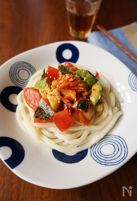 『アボカドとトマトのキムチ和えうどん』