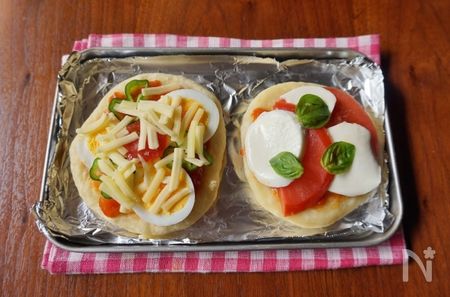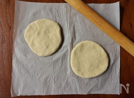 基本の生地を2等分にすれば、ミニピザを作ることもできます。丸く伸ばしたら、フライパンでピザ生地の両面を焼きましょう。